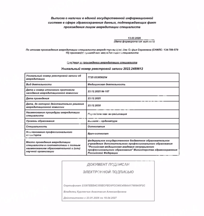 На приём к неврологу пригласили остеопата Лев Софью Сергеевну, она сразу же провела минимальные манипуляции с шеей, надавила на болезненные точки на спине, особенно около лопаток, сказала, что сможет мне помочь, тем самым дала надежду, что в этот день мне станет легче и наконец-таки нормально посплю. Было принято решение лечиться. После 50 минут остеопатии я вышла другим человеком, могла повернуть головой и не чувствовать прострелов в лопатку. После я посещала доктора раз в неделю. 3 процедуры, и весь спазм ушёл, далее ходила по назначению врача до 6 процедур, чтобы избежать повтора проблемы. Как и многие пишут, действительно у врача золотые руки. Спасибо, Софья Сергеевна!