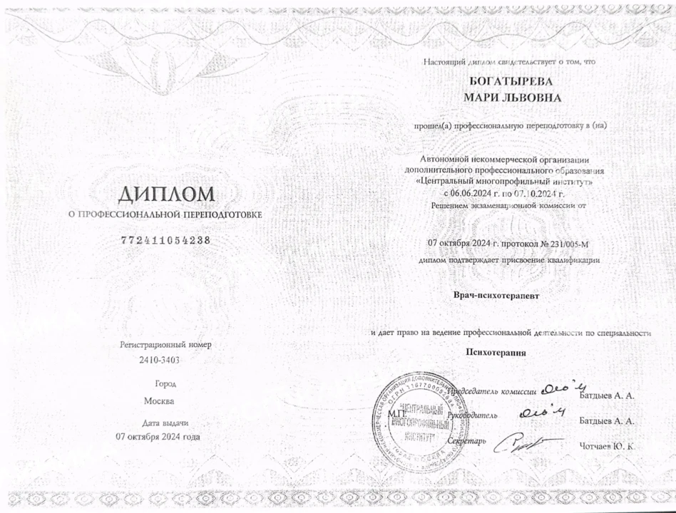 Очень доволен приёмом доктора Богатыревой Мари Львовны. Несмотря на небольшой стаж , оказалась очень талантливым и грамотным специалистом , который умеет выявлять причину следствия проблемы с которой обращаешься . Основной плюс, который я заметил на приёме , в отличии от других более опытных специалистов среди психотерапевтов использует методики - «новой школы».После первой консультации под впечатлением , многие факторы для себя понял и переосмыслил. Записался через неделю на индивидуальную психотерапию .